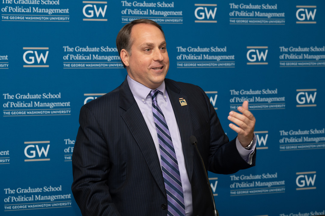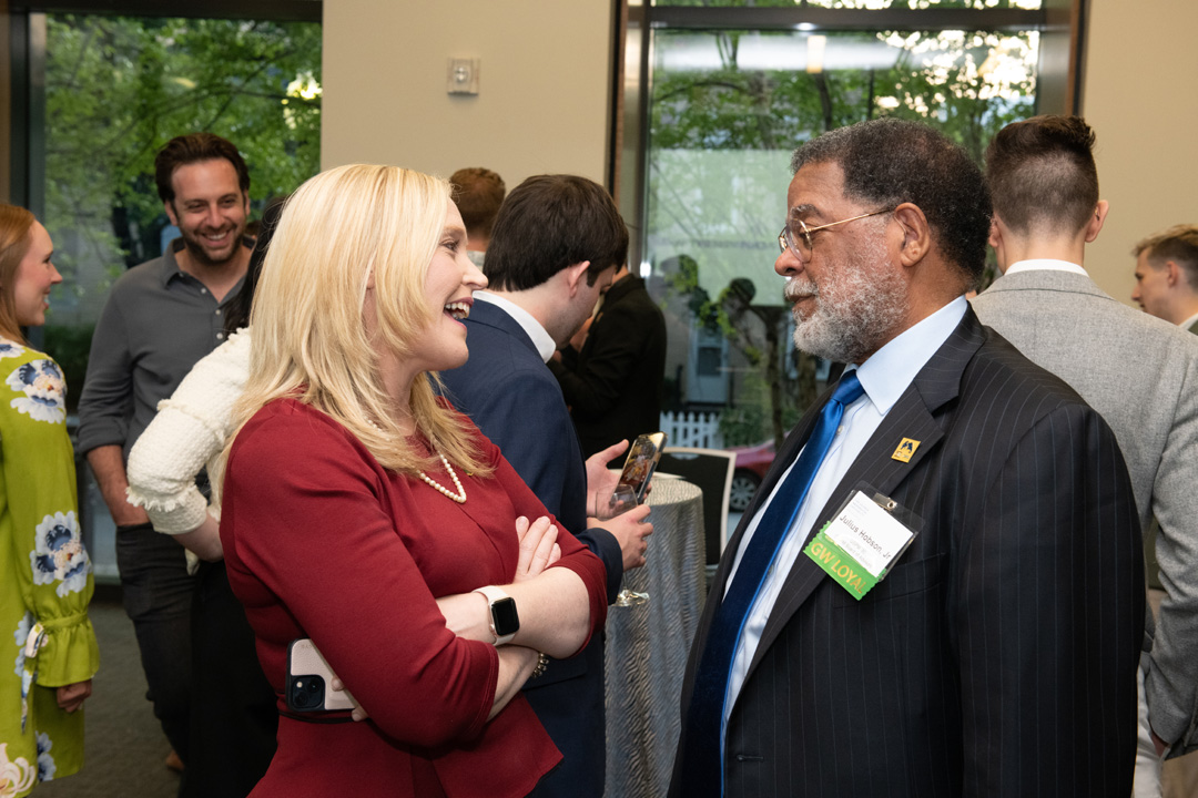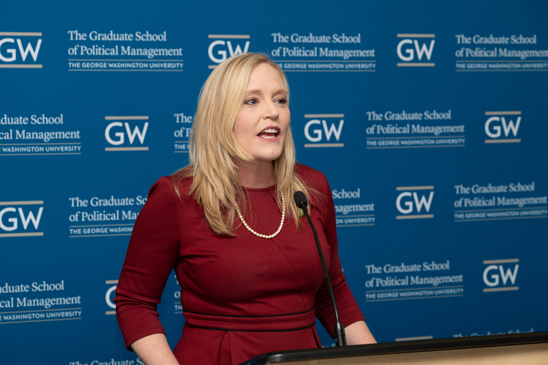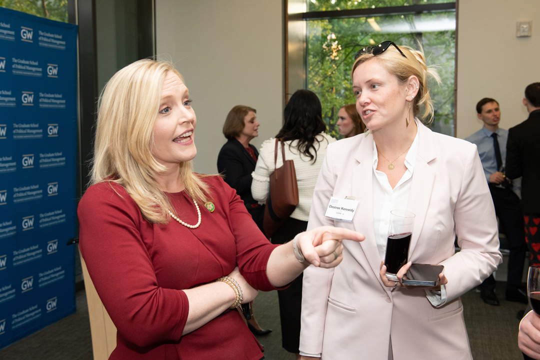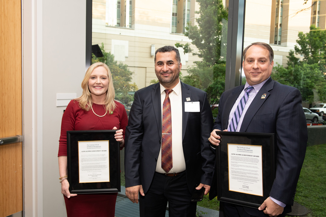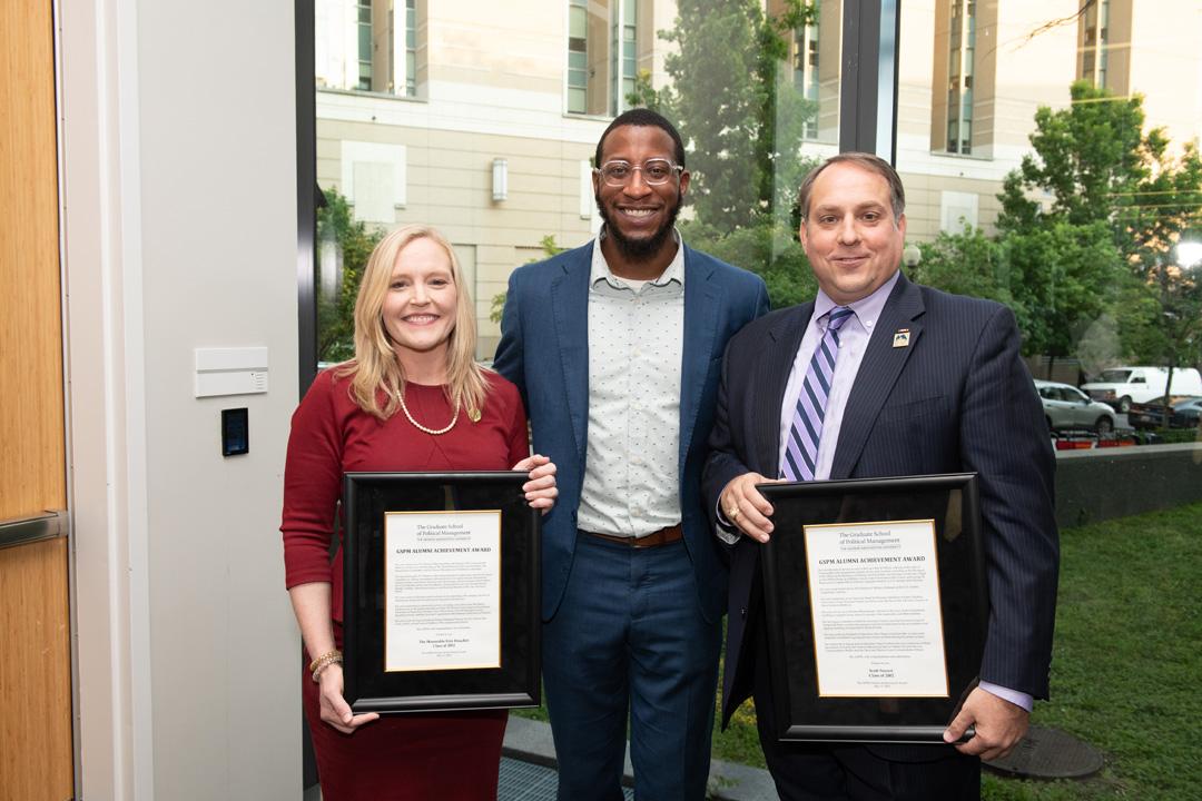 This year’s GSPM Alumni Achievement Awards were presented to Erin Houchin, GSPM '12, U.S. House Representative and Scott Suozzi, GSPM '02, Commander, JAG Corps, U.S. Navy (Ret.). The award is given to alumni who exemplify GSPM’s values through their career accomplishments, contributions back to their communities, GSPM, or GW.